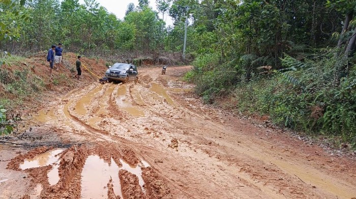 Jalan untuk menuju Desa Sindang Laya dan Mukti Karya tersebut berada di Kecamatan Muara Lakitan, Musi Rawas, Sumatera Selatan. Jalan tanah tersebut kondisinya rusak parah akibat hujan deras yang melanda Musi Rawas sehingga jalan menjadi becek dan tidak bisa dilewati oleh kendaraan.