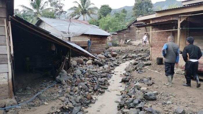 Akibatnya, air mengalir deras ke anak-anak sungai dan membawa material lumpur, kayu, sampah, hingga bebatuan ke permukiman warga.