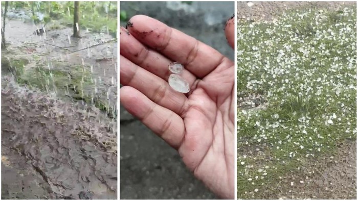 Dalam video yang diterima infoSumbagsel, tampak bongkahan es batu berukuran kerikil jatuh bersamaan dengan air hujan memenuhi perkarangan rumah warga.