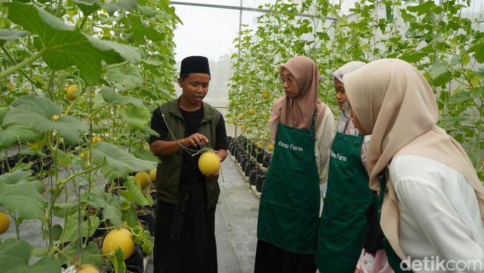 Selepas kajian agama, tiga santriwati Pondok Pesantren Al-Mutaqqin di Desa Ibru, Kecamatan Mestong, Kabupaten Muaro Jambi, Jambi, memanen perdana melon Inthanon. Melon yang ditanam di greenhouse halaman pesantren ini merupakan pondasi ketahanan pangan pesantren tersebut.
